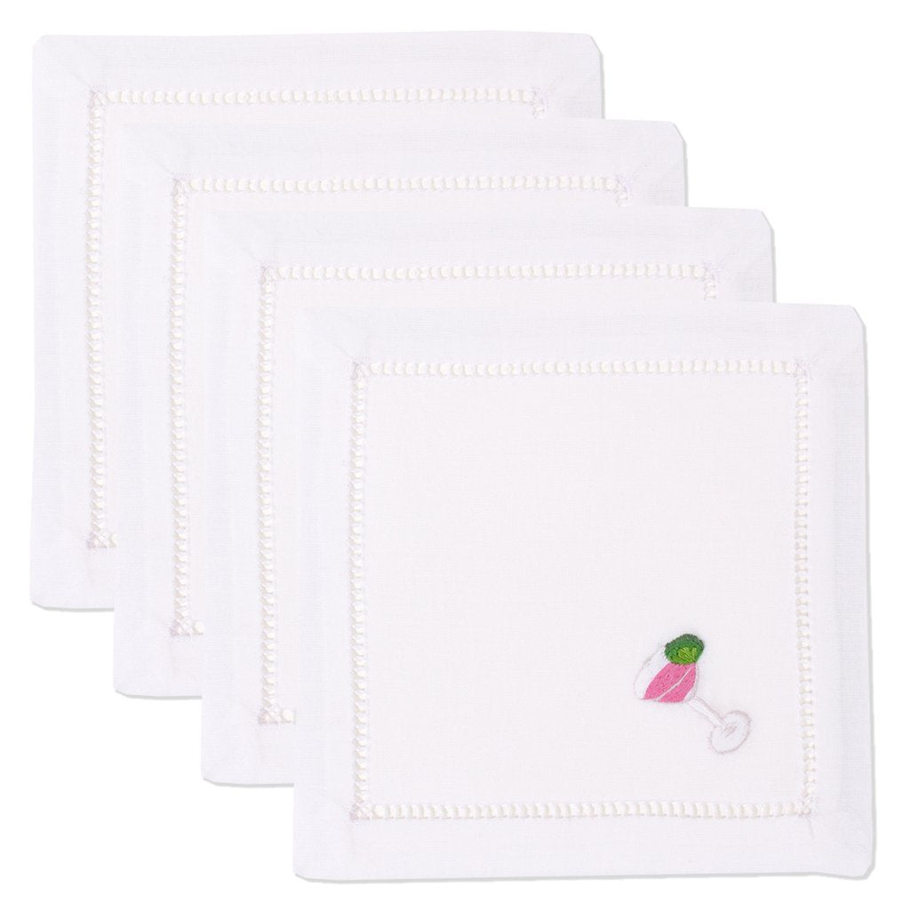Hand-embroidered cocktail napkins on 100% cotton, finished and hemstitched by hand.