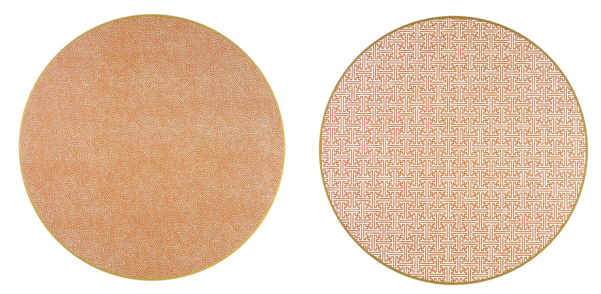 Holly Stuart Home is pleased to offer TWO SIDED REVERSIBLE Screen Printed Placemats. One side has the ever popularDot Fan pattern and the reverse the Signature Sayagata pattern. Both sides are protected with a matte finish and trimmed in gold. Just wipe with a damp cloth and you are good to go. Made in the US.