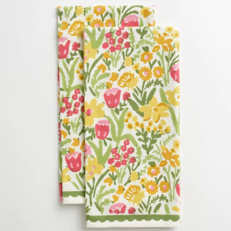 100% Cotton. Machine wash cold. Tumble Dry Low. Made in India. Sold as a set of 2. Each tea towel measures 20"x26".