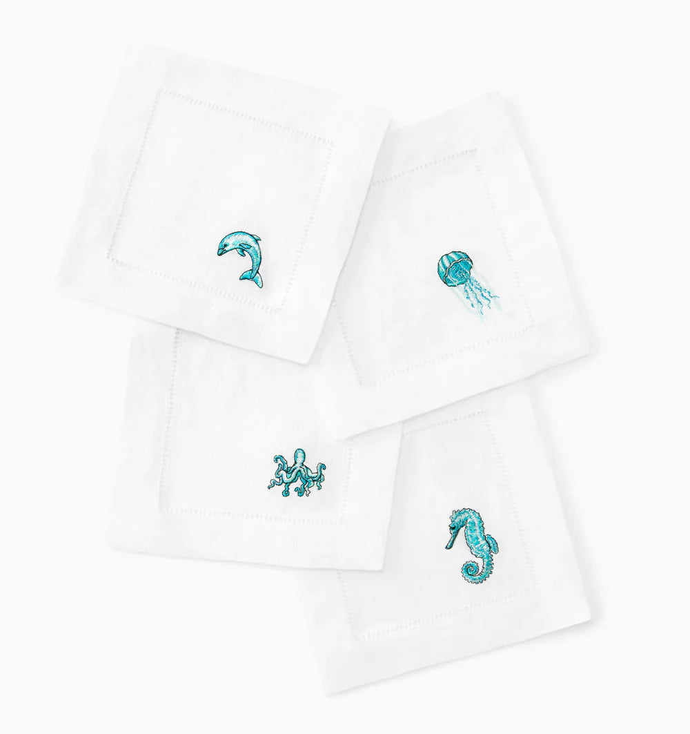 Inspired by the marine life found in the idyllic waters of the Tyrrhenian sea in the Amalfi Coast, these whimsical cocktail napkins crafted of pure white hemstitched linen with aqua-hued embroidered sea creatures will bring the beauty and charm of cocktails on the terrace at Le Sirenuse to your home.
