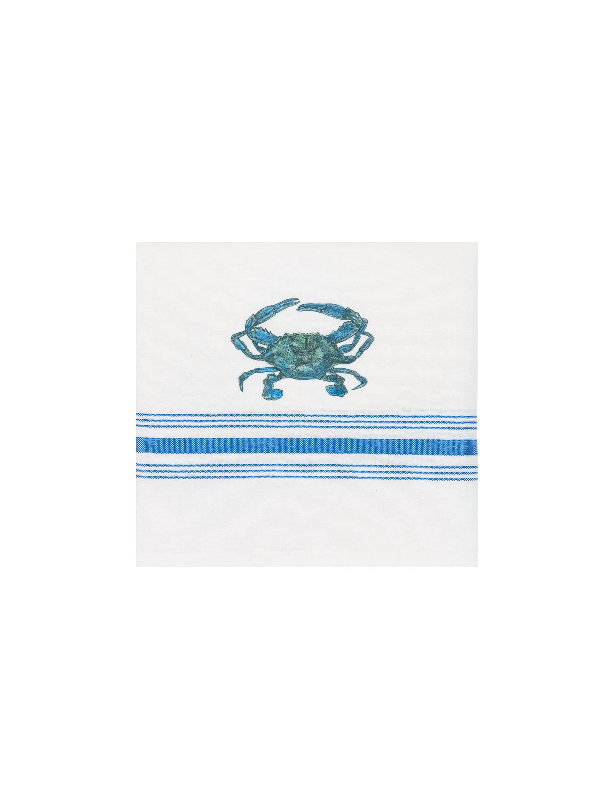Made exclusively for Weston Table, this easy care, no iron set of four blue striped napkins has our original crab illustration printed on a commercial, restaurant quality bistro napkin.