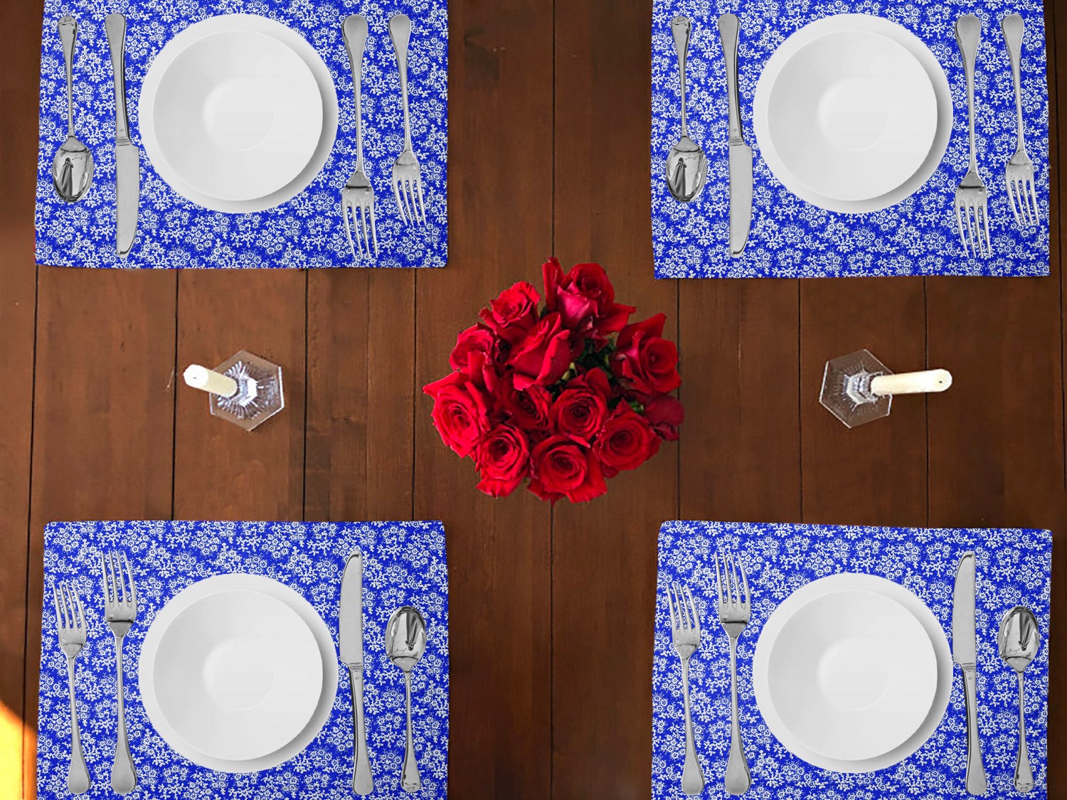These placemats are made from a soft cotton blend material with a pattern and lined with a polyester backing. Hemmed edges, pack of 4, 13" x 19". Machine washable, with no tags sewn in. Made in California.