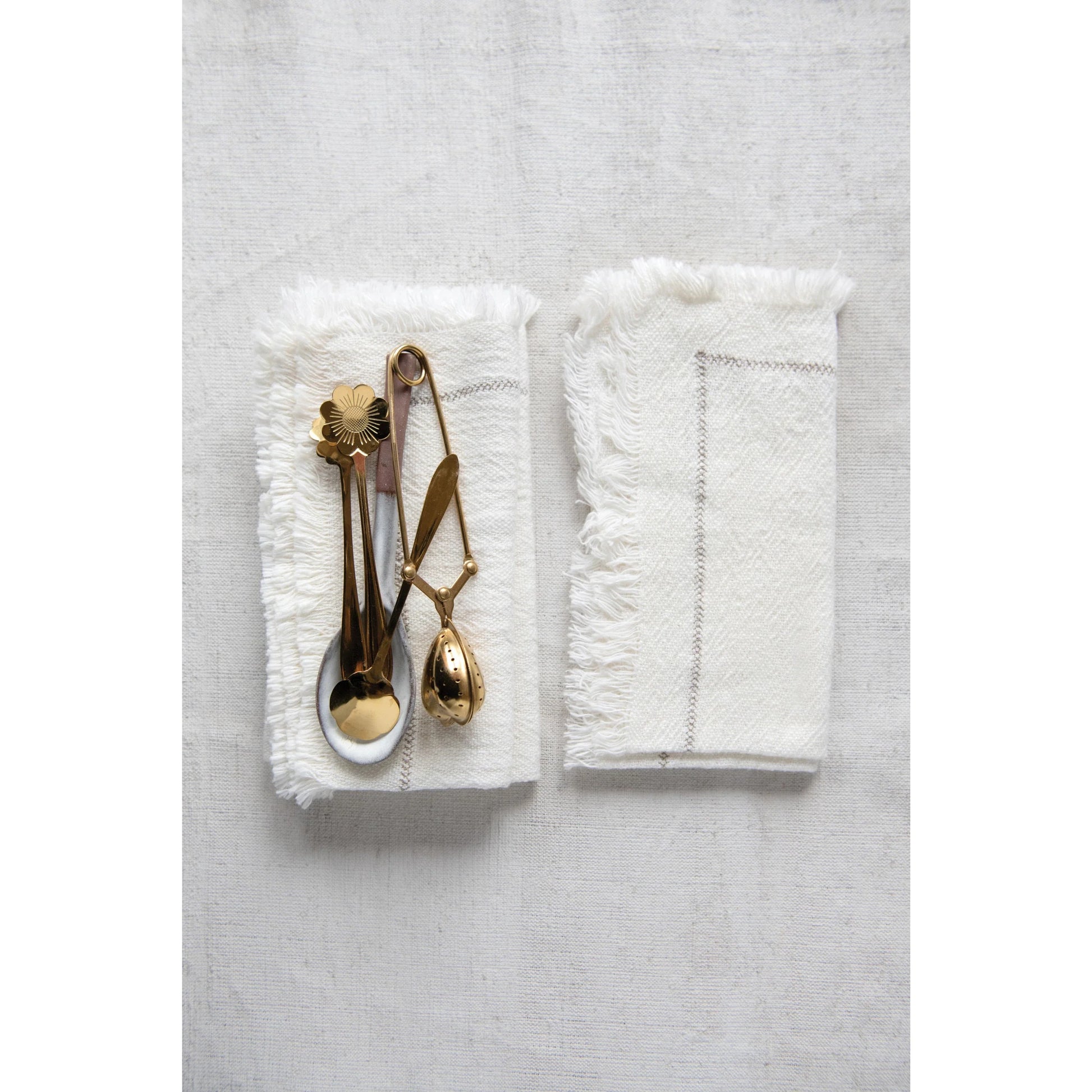 These soft white napkins with decorative fringe will add distinctive charm to each table setting at your next dinner. Each napkin can be folded and placed under the forks, rolled up inside a napkin ring, centered on the plate at an angle or placed inside an empty glass with the corners pointing upward. In the middle of the table, spread one of the napkins under the centerpiece and create an overall eye-pleasing cohesive look.