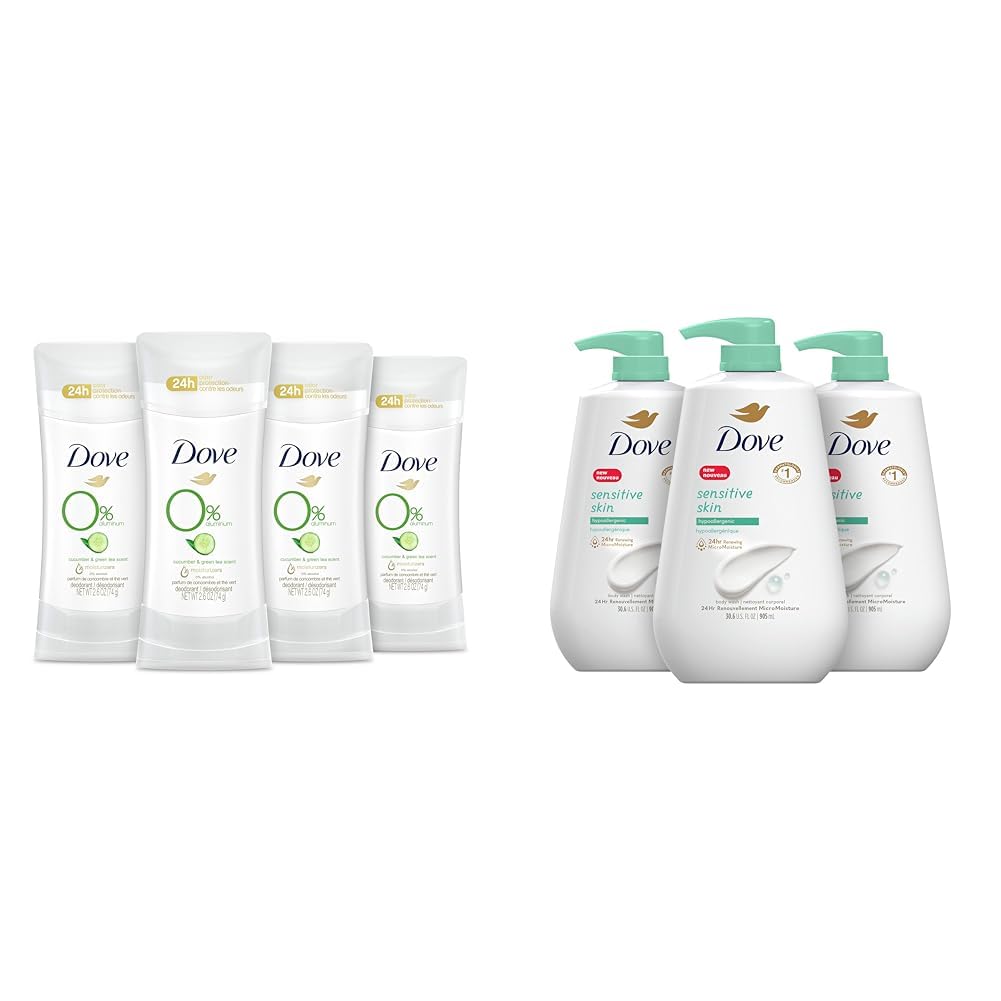 Dove 0% Aluminum Deodorant 24 Hours Odor Protection Cucumber and Green Tea with ¼ Moisturizers & Sensitive Skin Body Wash, Hypoallergenic and Paraben-Free, 30.6 fl oz (Pack of 3)