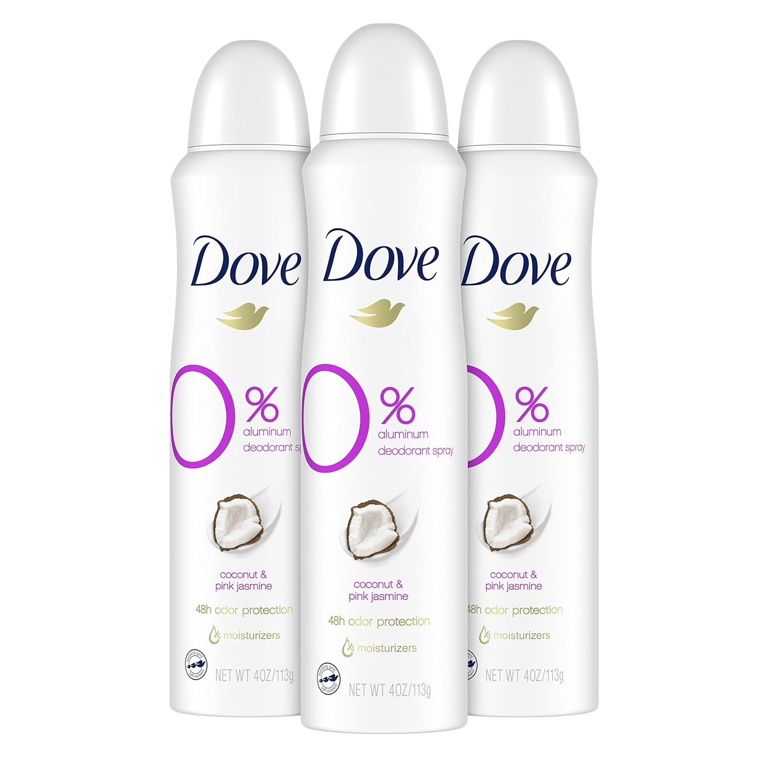 Dove 0 percent Deodorant Spray For 48 Hour Protection Coconut and Pink Jasmine Aluminum Free Deodorant 4 oz 3 Count, White, 4 Ounce (Pack of 3)
