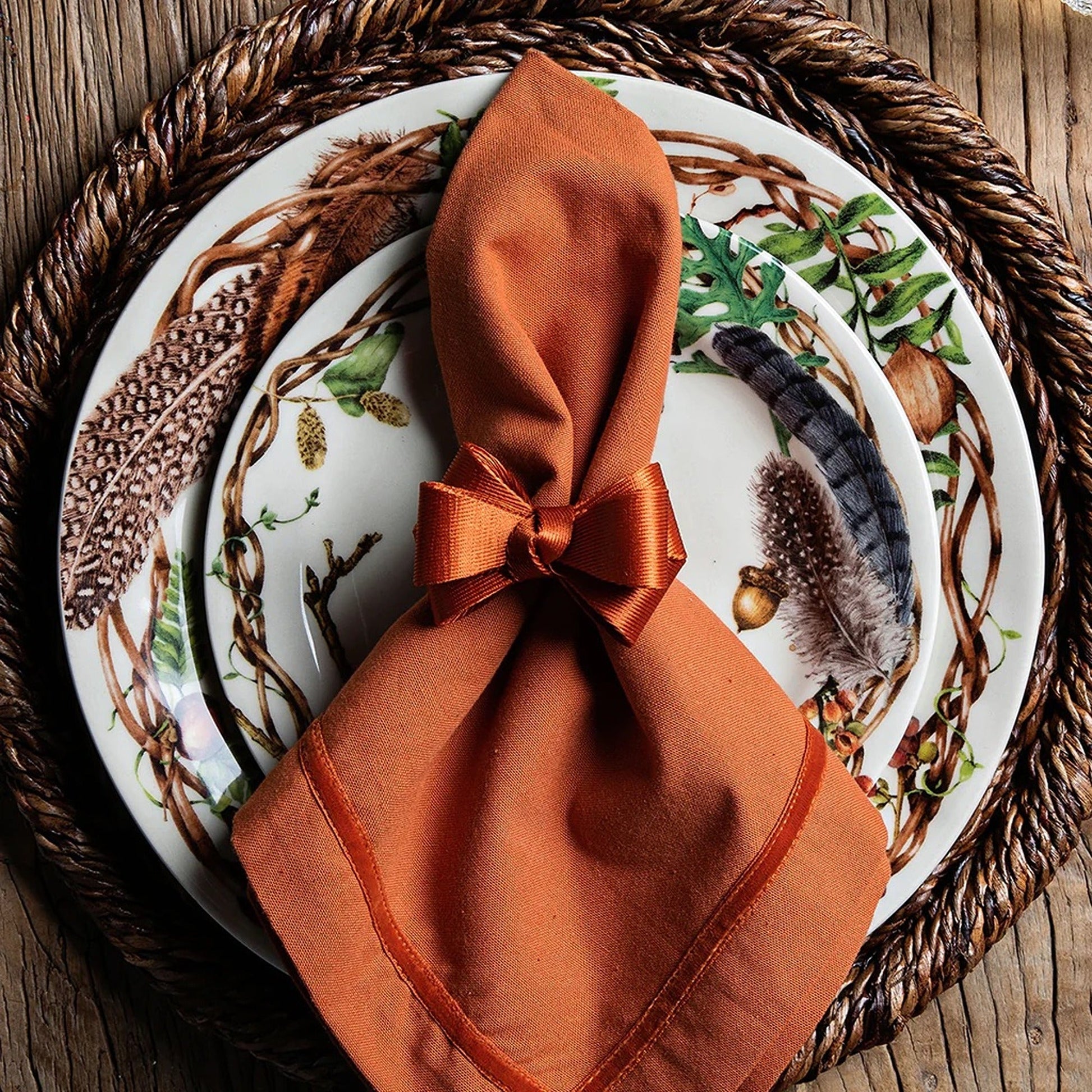 Host Notes: Elevate your table setting with this woven napkin in a handsome pumpkin hue, adorned with a velvet ribbon trim, for a touch of autumnal elegance. Pairs well with Juliska's Pumpkin Tuxedo Napkin Ring.