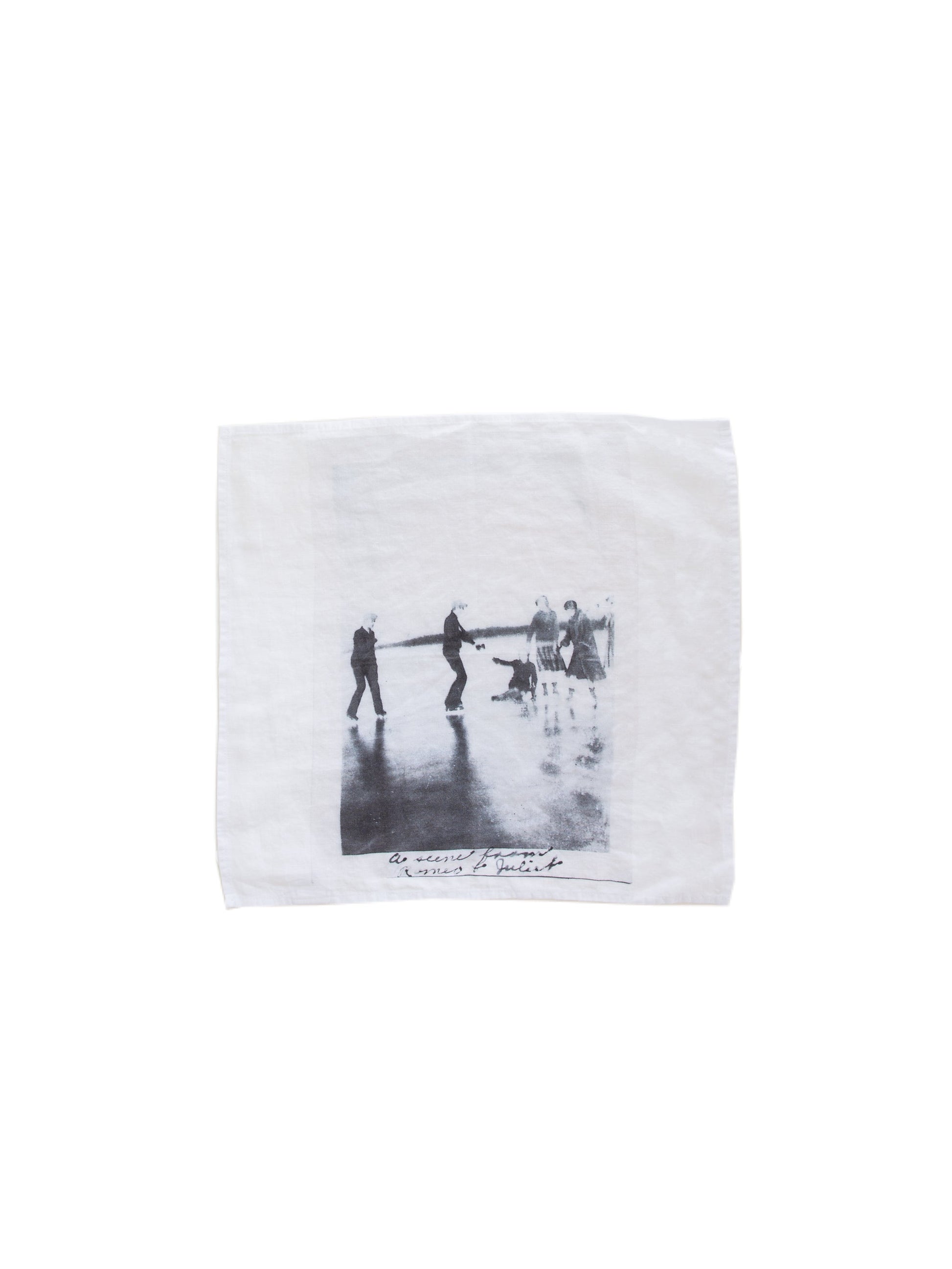 A vintage illustration of skaters on a pond are printed in Paris on pure stone washed linen napkins using natural and durable materials of water-based, non-toxic inks.