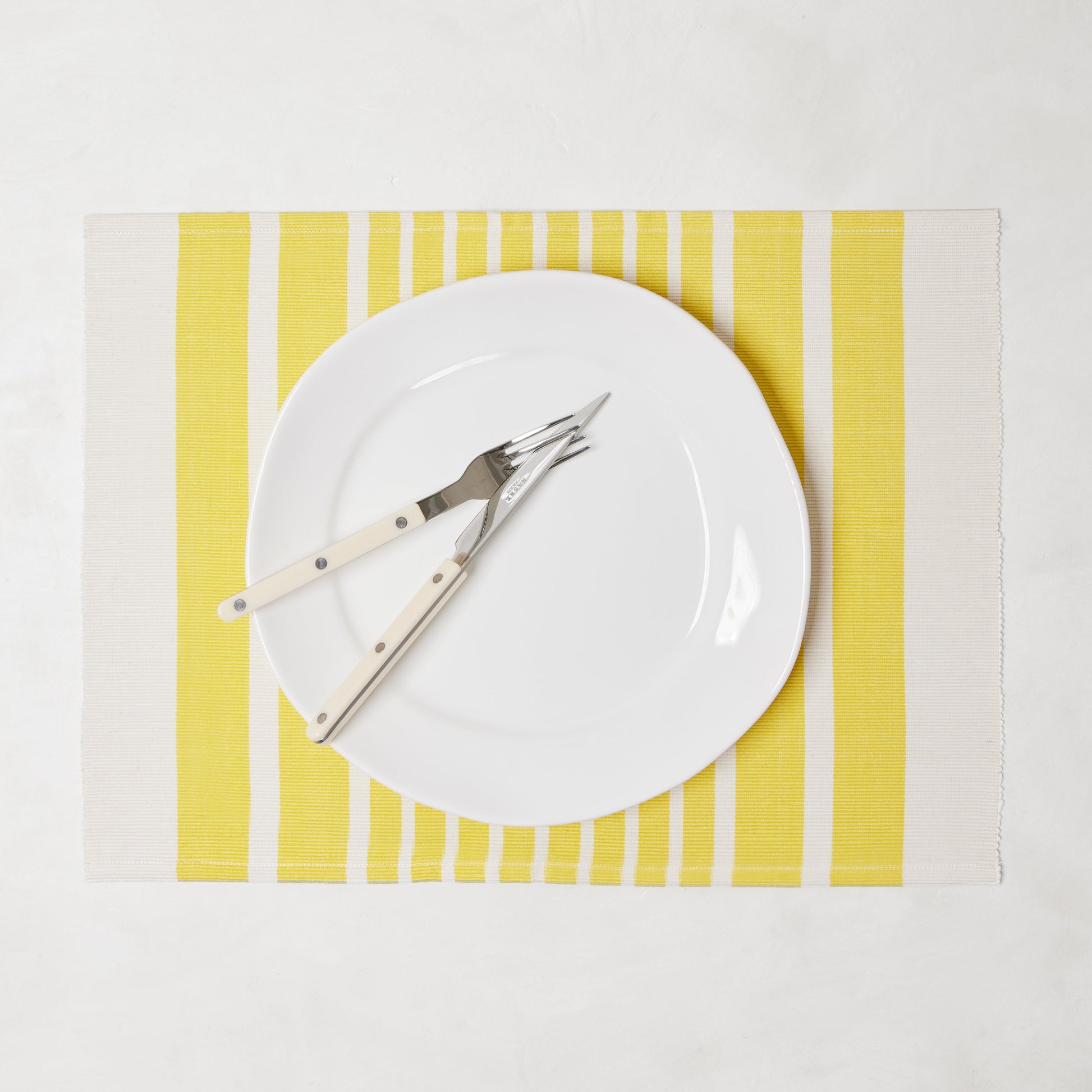 Our Yellow Stripe Woven Placemats come in a set of 4 and feature a fresh and fun yellow and white stripe design that'll add a pop of color to your entertaining. Made with 100% cotton, they're durable and a breeze to clean. Plus, they're perfect for mixing and matching.